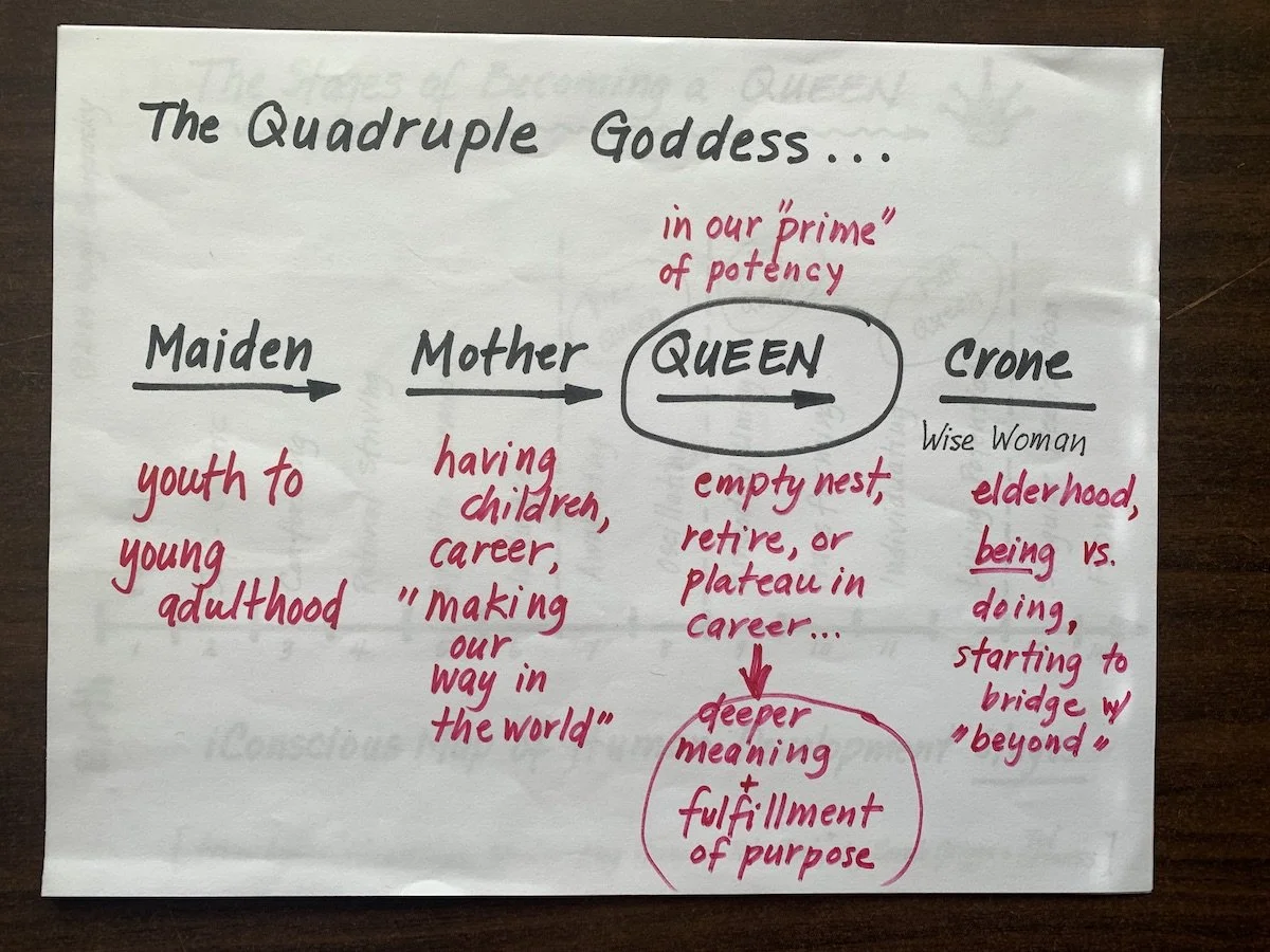 I've overlaid upon the iConscious map the Maiden—Mother—QUEEN—Crone model, and I’ve zoomed in and delineated what I believe to be the relevant stages of becoming a fully-awakened, fully-realized Queen: