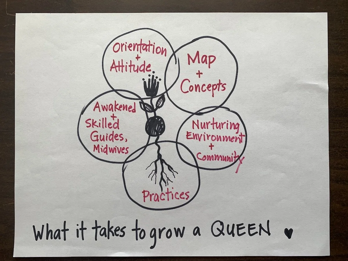 3. Skilled, Awakened Guides/ Midwives — Having women who have made the queen transition ahead of you, who know the territory, and who know how to support your self-birthing process, is truly invaluable. Not only can they provide role-modeling, but their wise support and nuanced guidance can help us navigate stuck and/or painful places, illuminate our hidden patterns, give us tips and tricks to avoid pitfalls, and point us in fruitful directions.