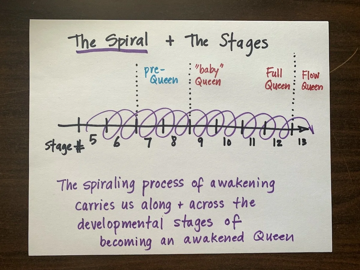 In my experience of becoming a queen and in my many years of supporting others in their embodied awakening process, it seems to me that the process of growth/ evolution is like a spiral.